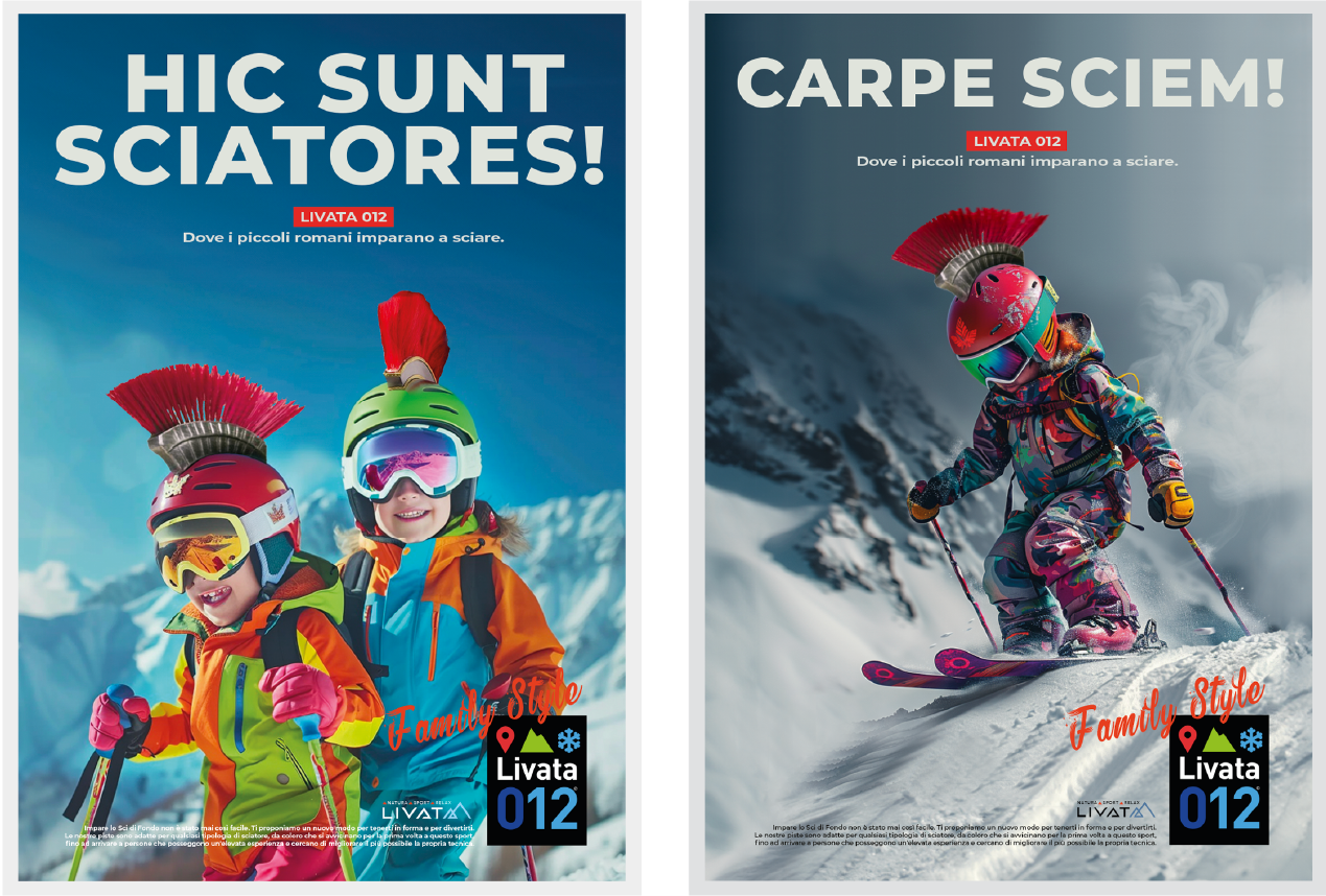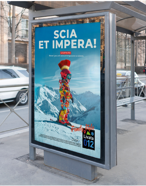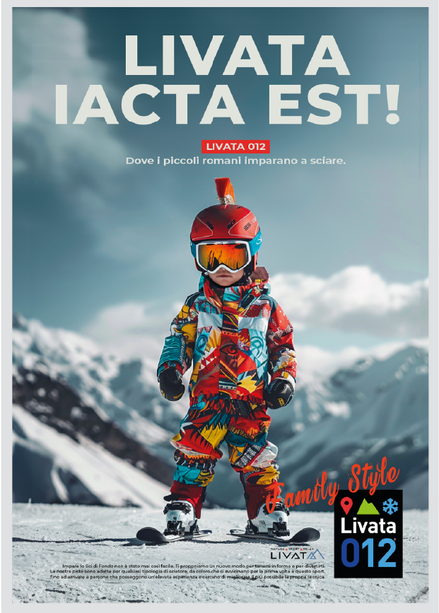 Livata è una storica località sciistica a pochi chilometri da Roma, dimenticata negli anni e oggi oggetto di un progetto di rilancio rivolto a un nuovo pubblico. Abbiamo ripensato da zero il posizionamento della località, puntando su ciò che la rende unica: la vicinanza alla capitale, l’ambiente sicuro e l’atmosfera familiare. Da qui nasce Livata 012: un naming evocativo e semplice, pensato per attrarre famiglie e bambini. Abbiamo progettato logo, identità visiva e una campagna multisoggetto che unisce ironia e impatto: bambini in tuta da sci con pennacchi da antichi romani e headline volutamente “maccheroniche” fanno da protagonisti a un racconto visivo colorato, leggero e iconico.